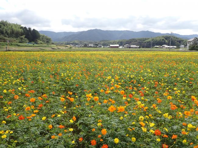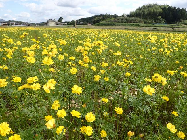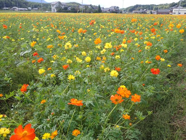 まんのう町では、ひまわりの時期以外にも黄色の花を咲かせようと、黄色のコスモスの種をまきました。